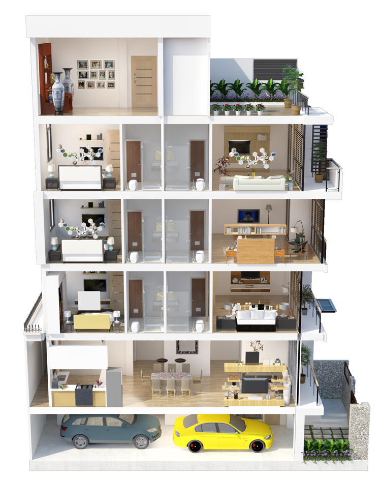 Tầng 3+4+5 : 2 Phòng ngủ + 2 Vệ sinh.